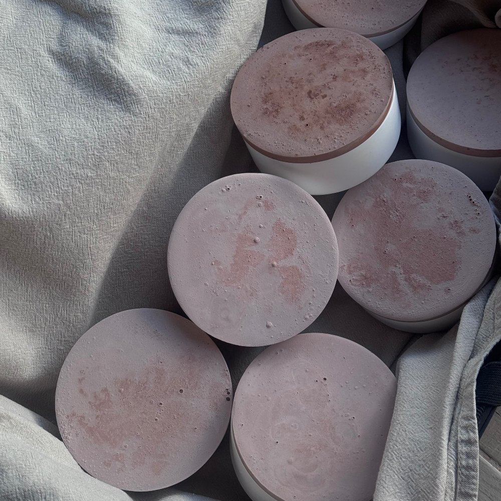 El yapımı kapaklı mum kabı. Tamamen taş tozu üretilmiştir. Dayanıklı yapısı ve doğal dokusu ile dekoratif kullanım için ve atölyelerde kullanım için uygundur.